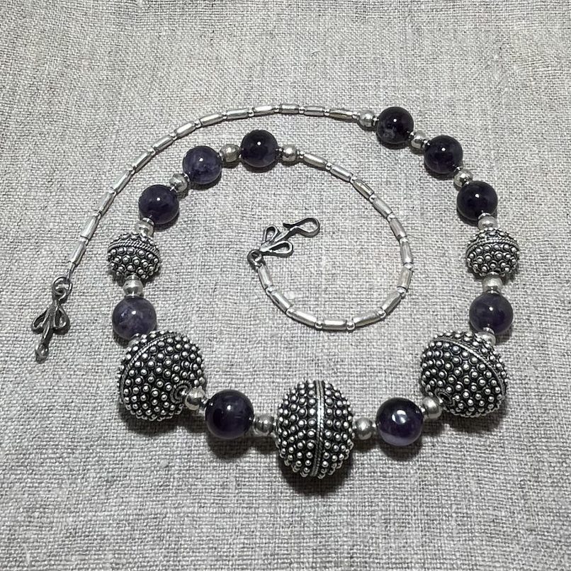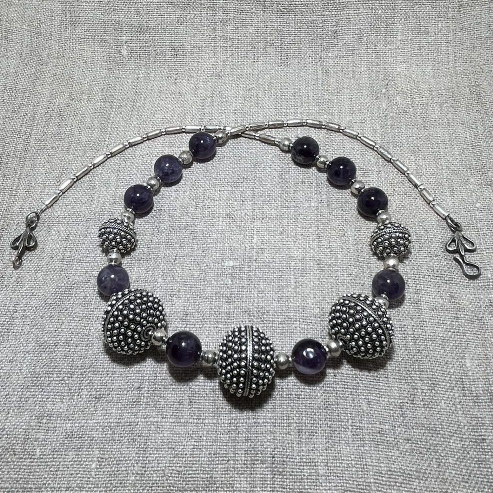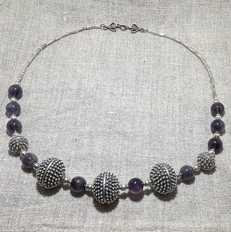 Amethyst stones with beautiful handmade granulated silver beads and small handmade silver beads and lotus clasp
