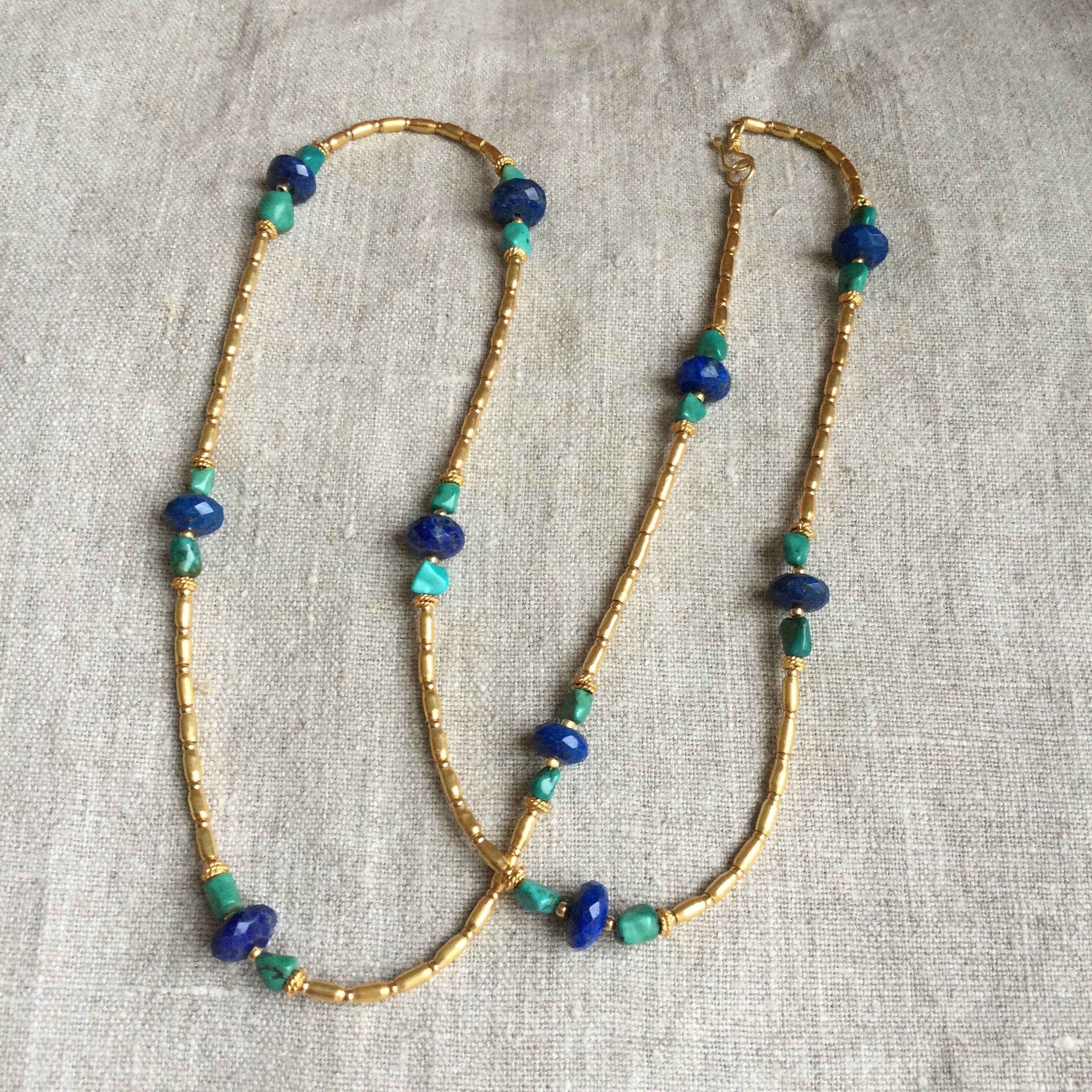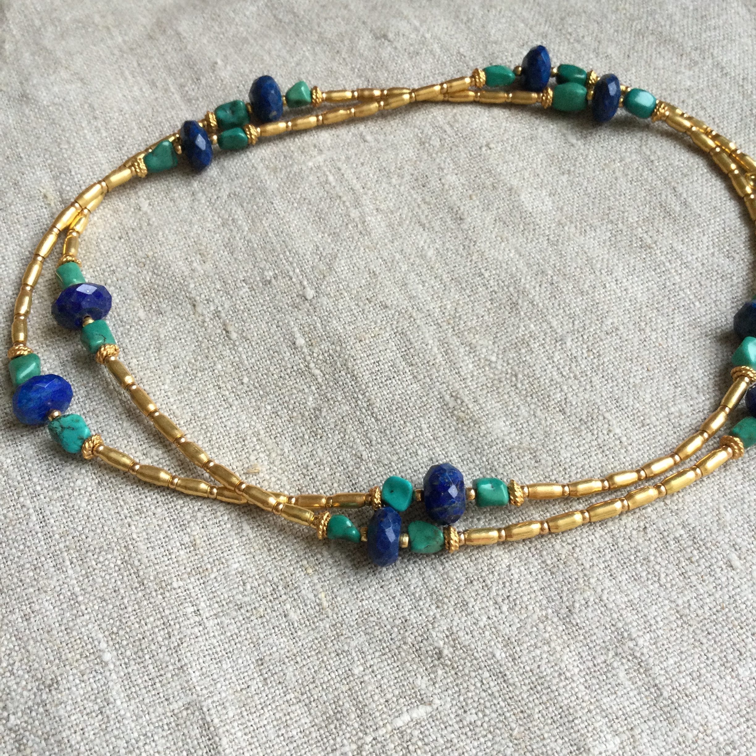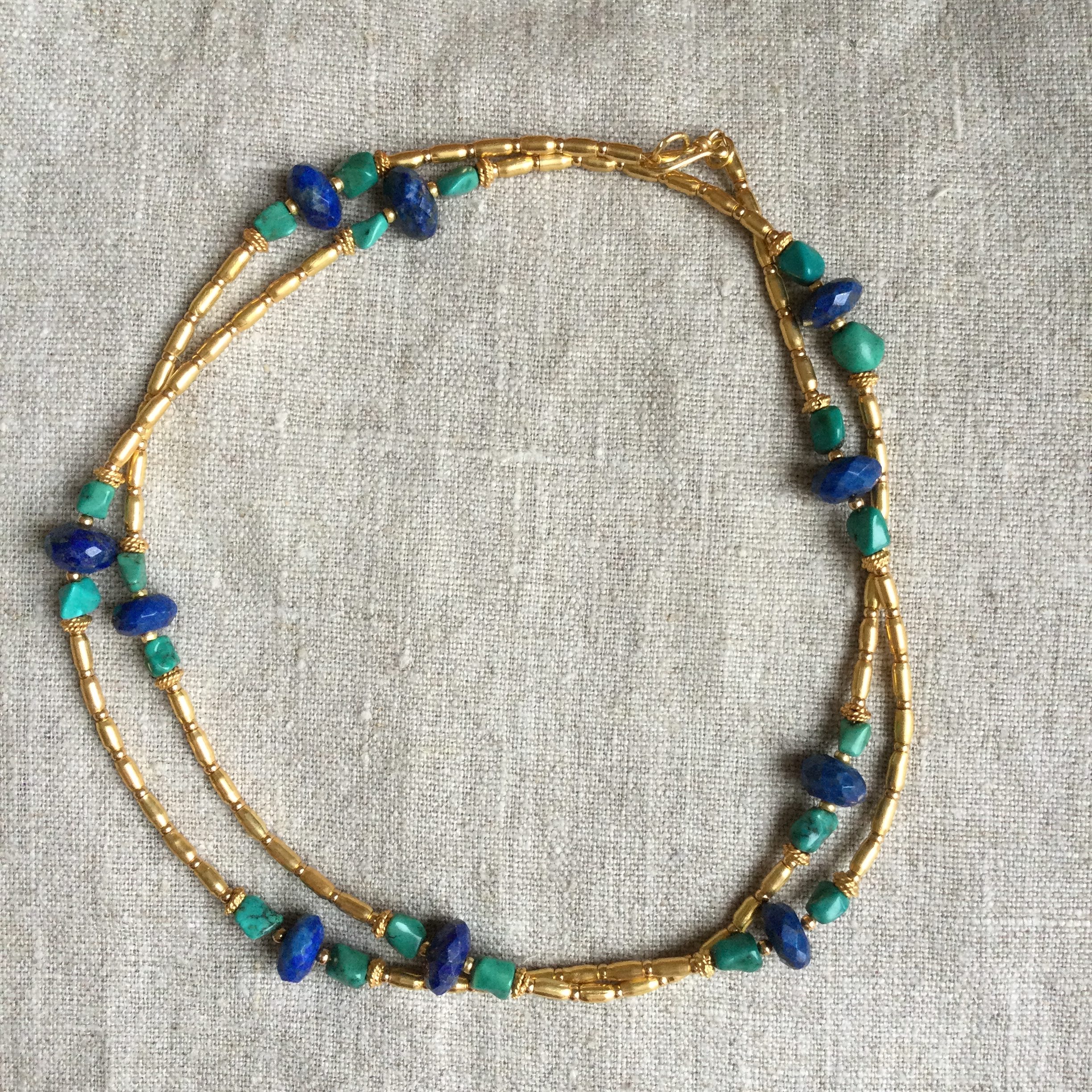 Lapis lazuli, turquoise, gold plated handmade silver beads