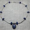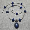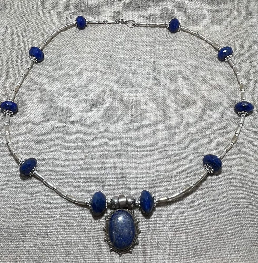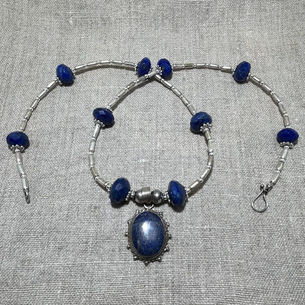 Beautiful lapis lazuli beads alongside handmade silver beads and a pendant set with lapis lazuli