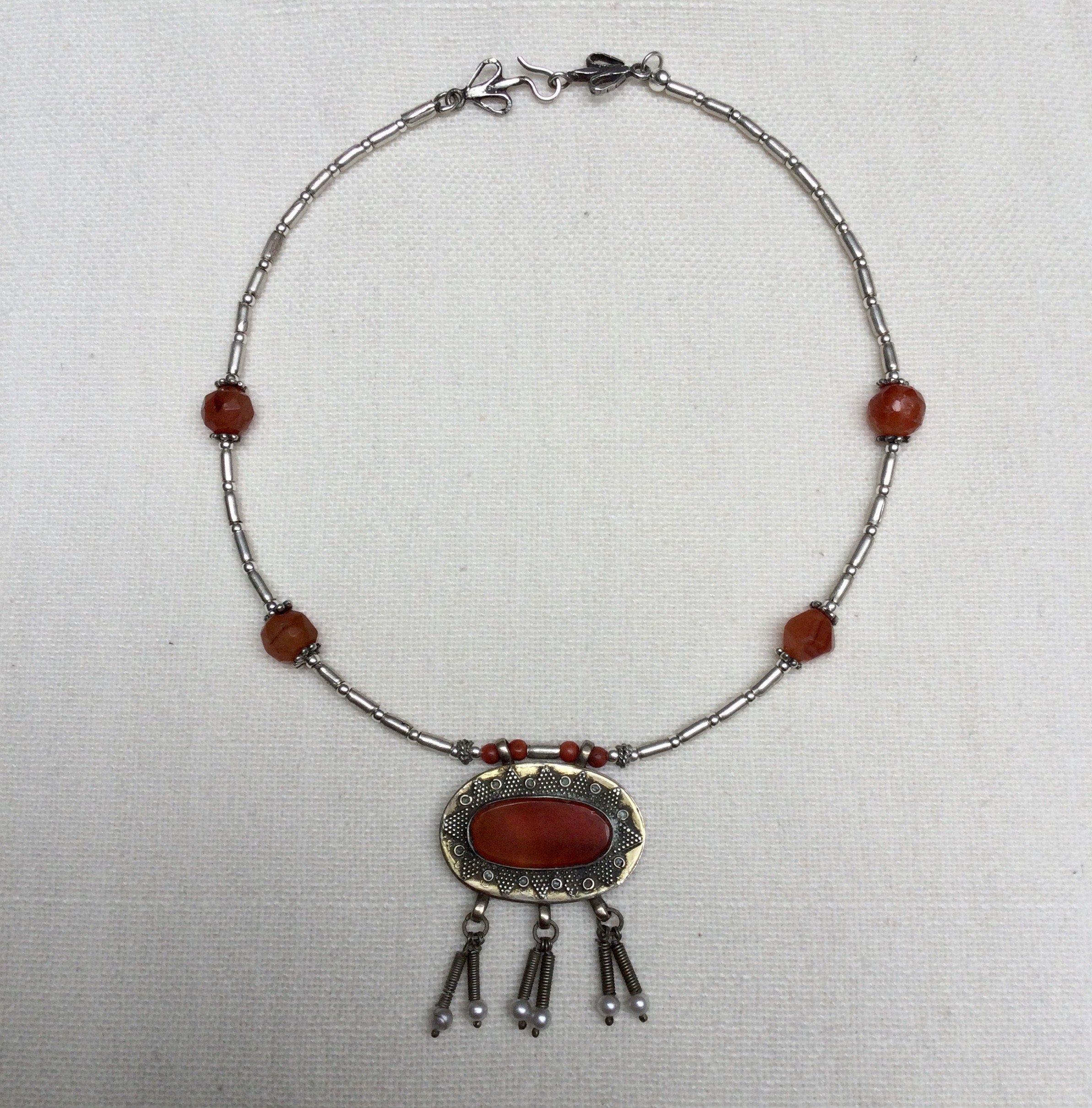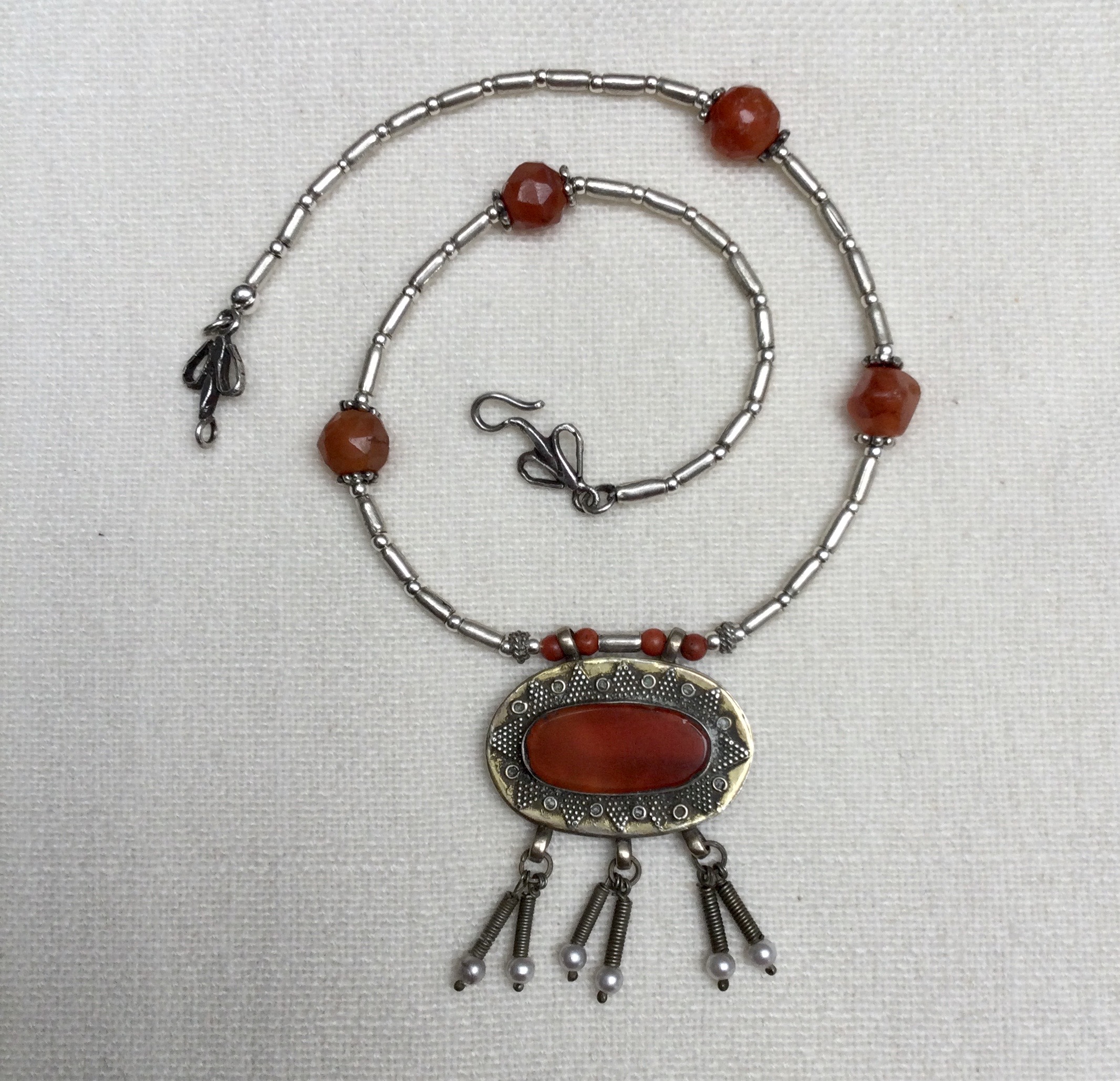 Faceted agate stones alongside handmade silver beads and a pendant set with agate