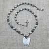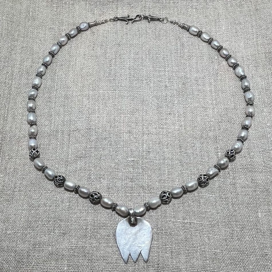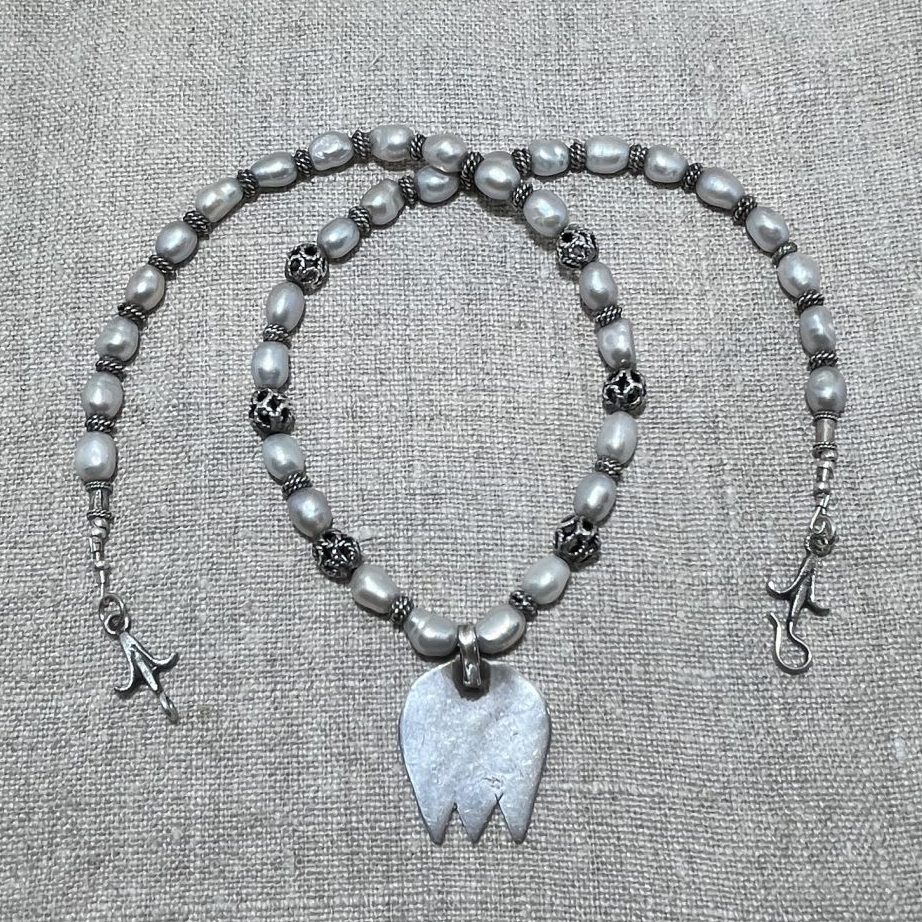 Beautiful grey pearls alongside handmade silver beads and an antique Omani silver pendant symbolizing the hand of Fatima