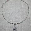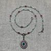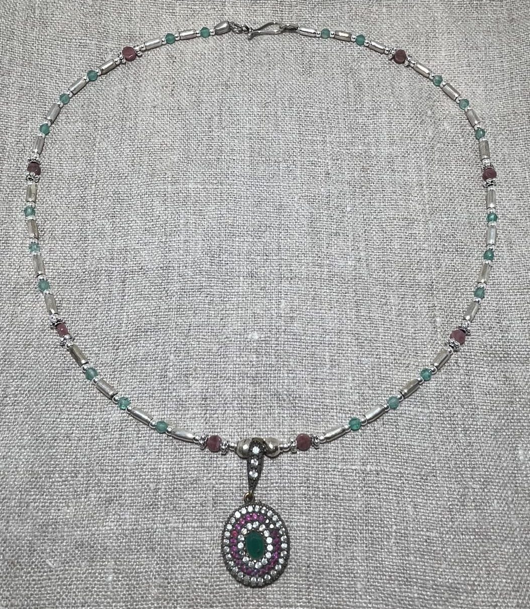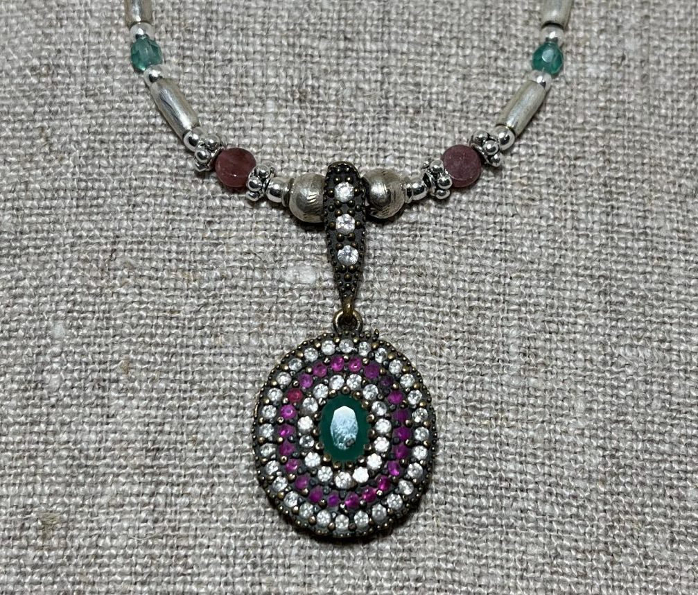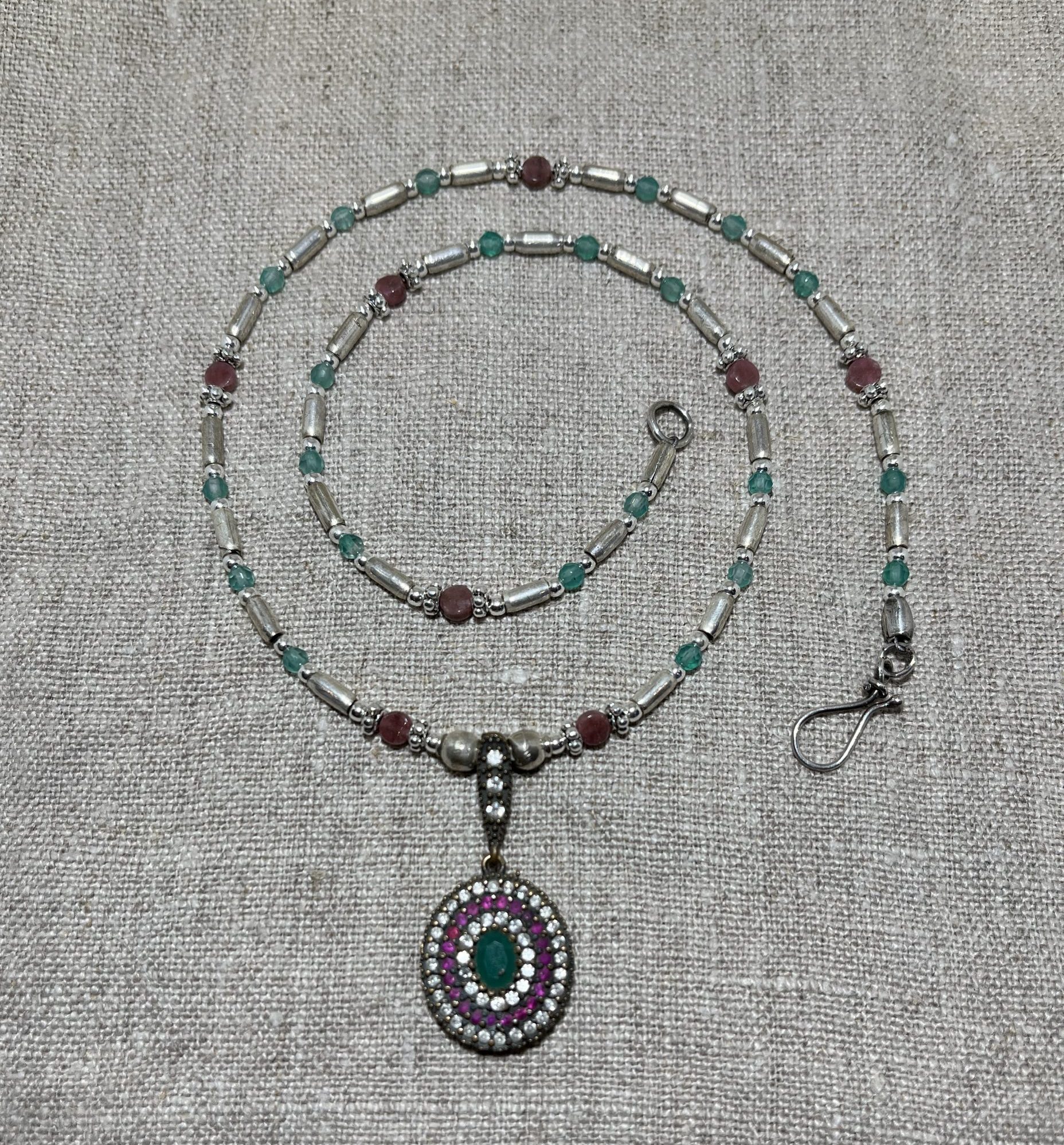 Very pretty pendant set with rubies and emerald, on chain of small rubies, emeralds and handmade silver beads