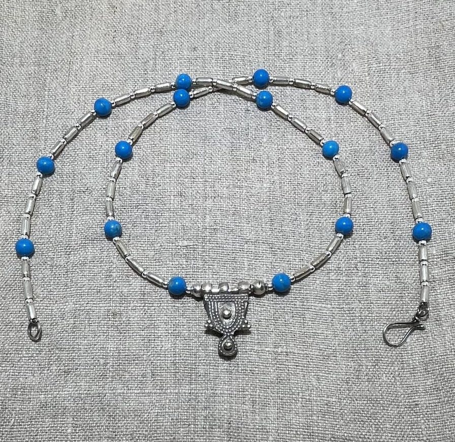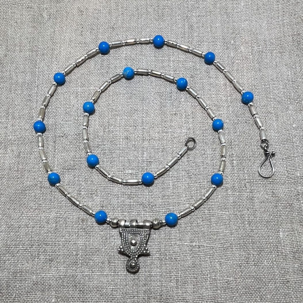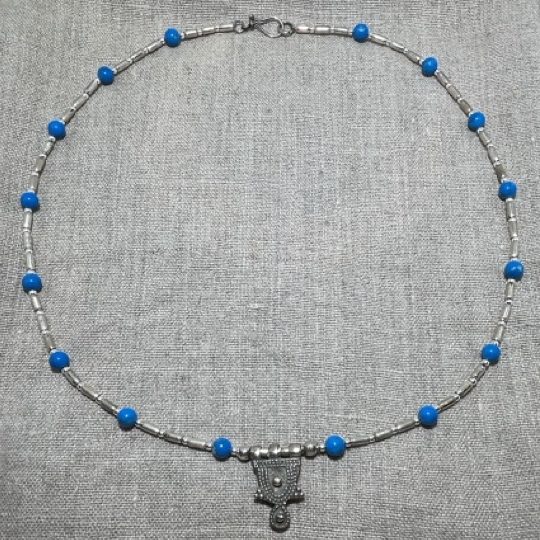 Beautiful sodalite blue beads alongside handmade silver beads and an old Ethiopian telsum (talisman) pendant
