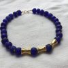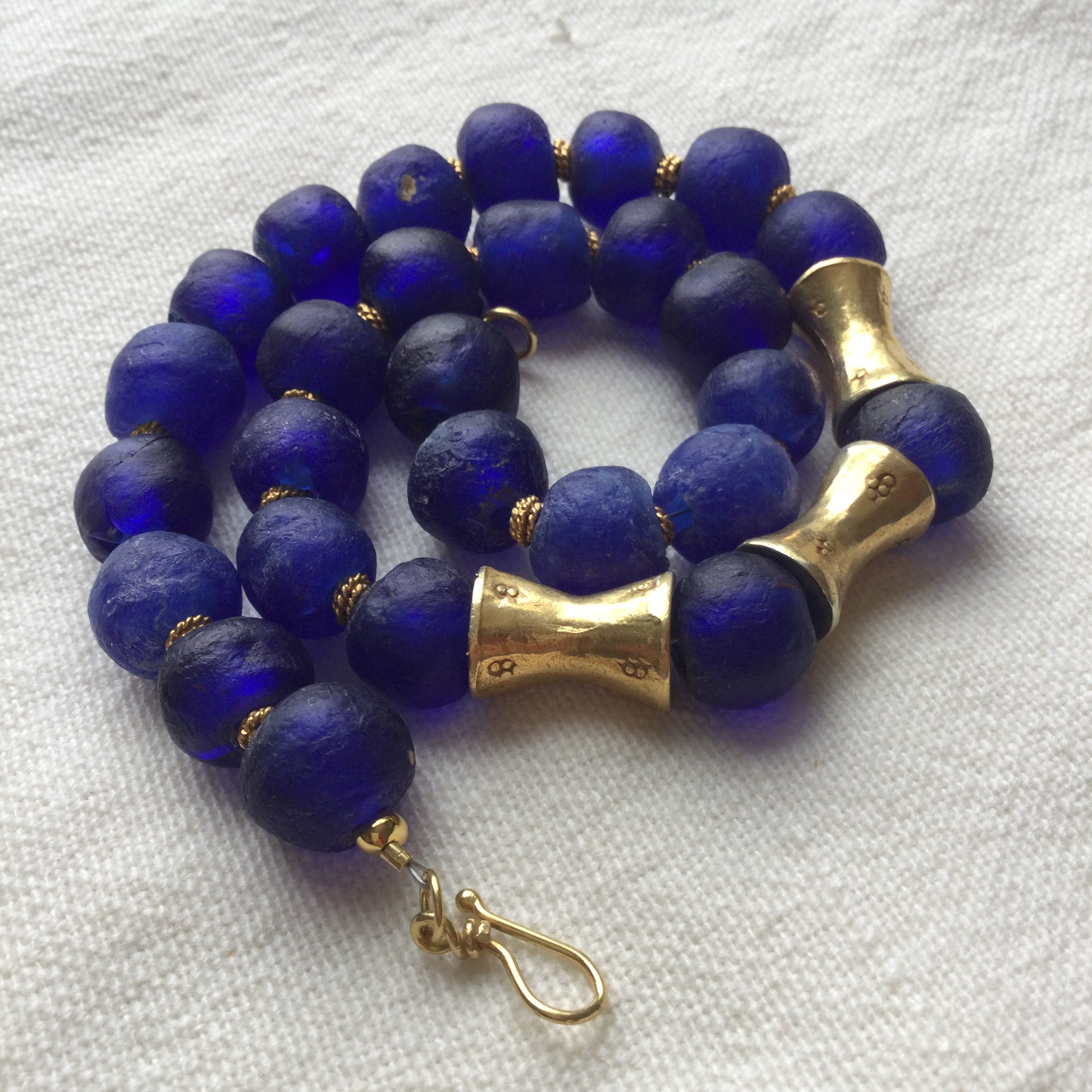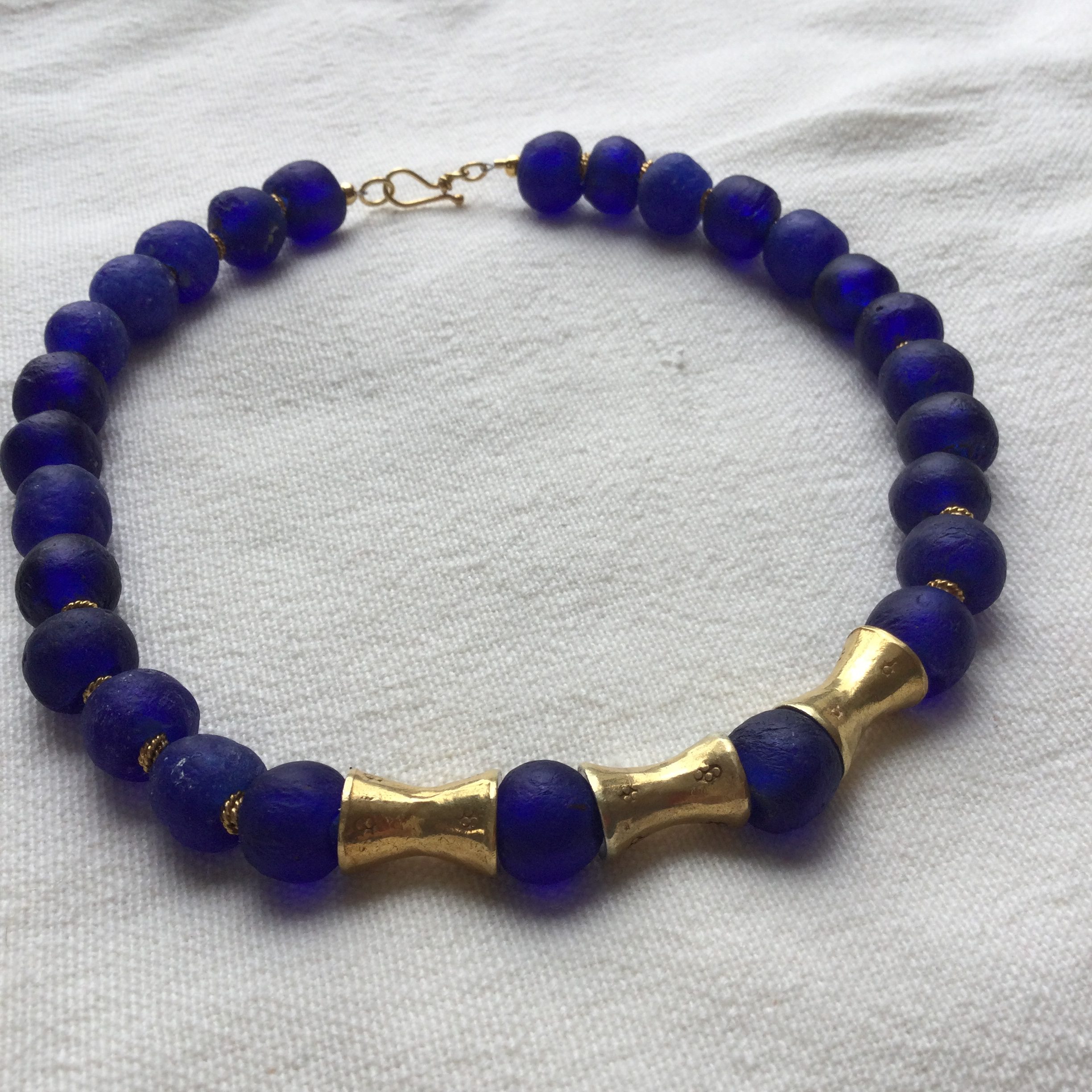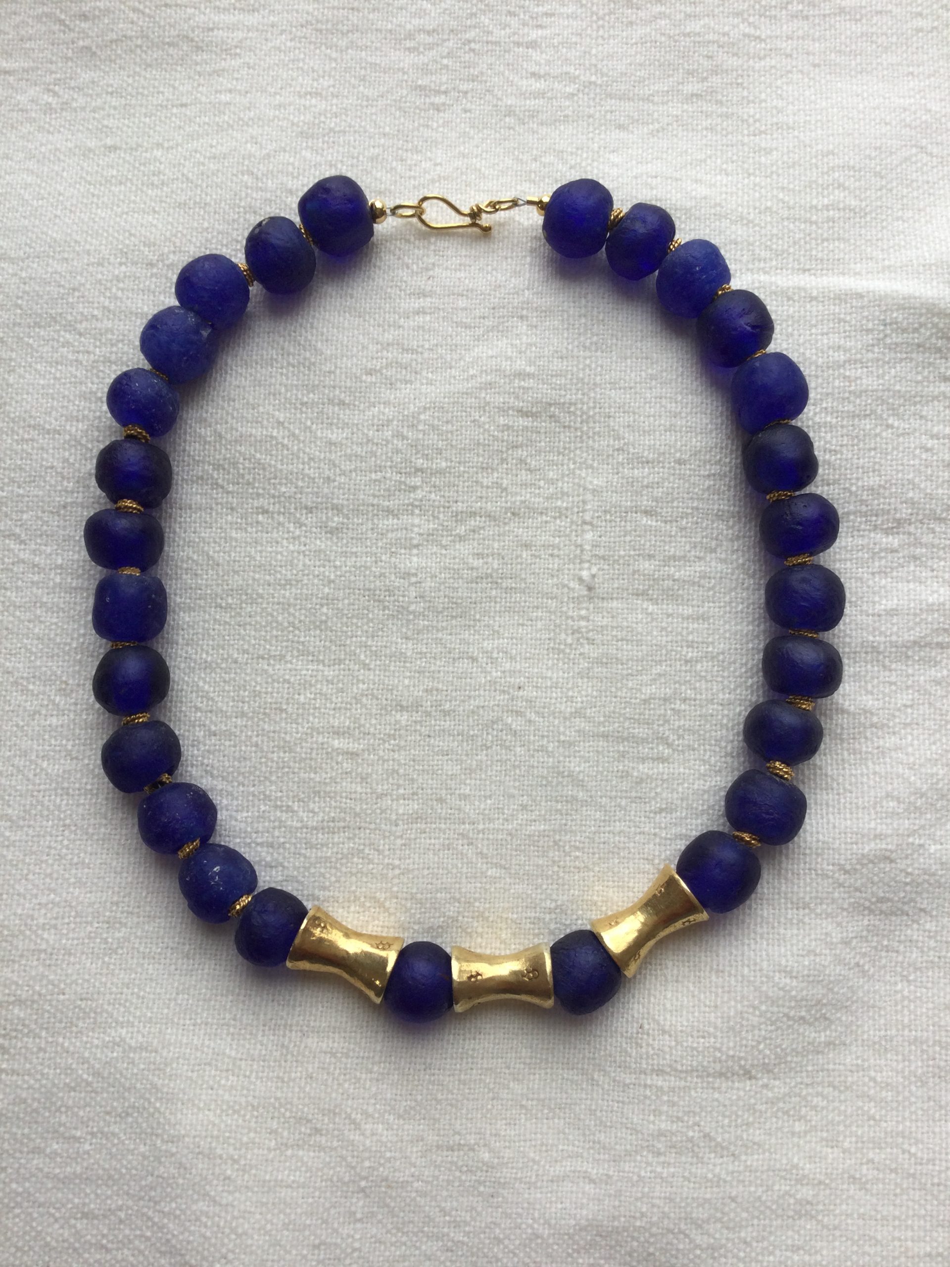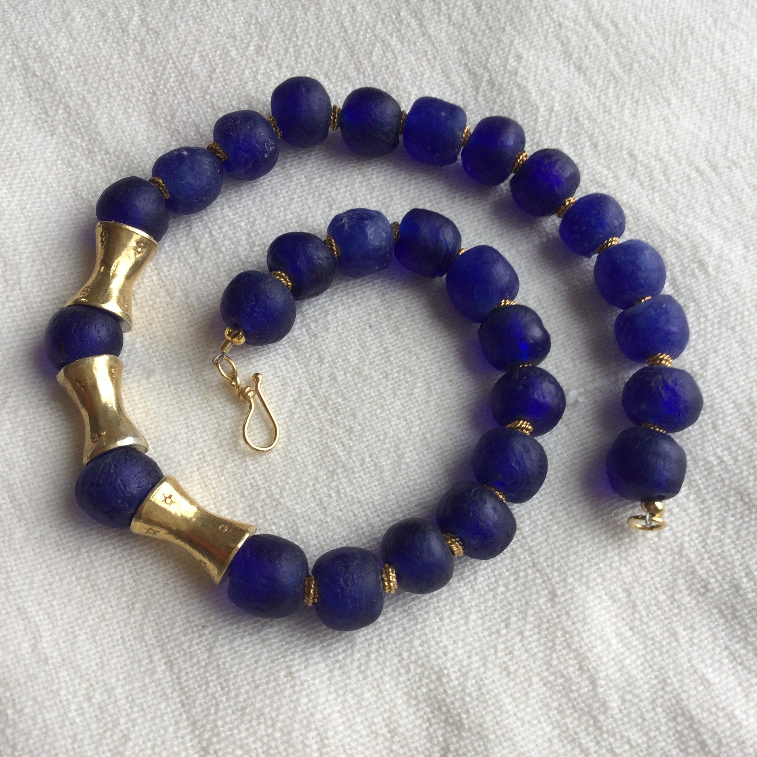 Recycled glass bottle beads from Ghana with handmade gold plated beads