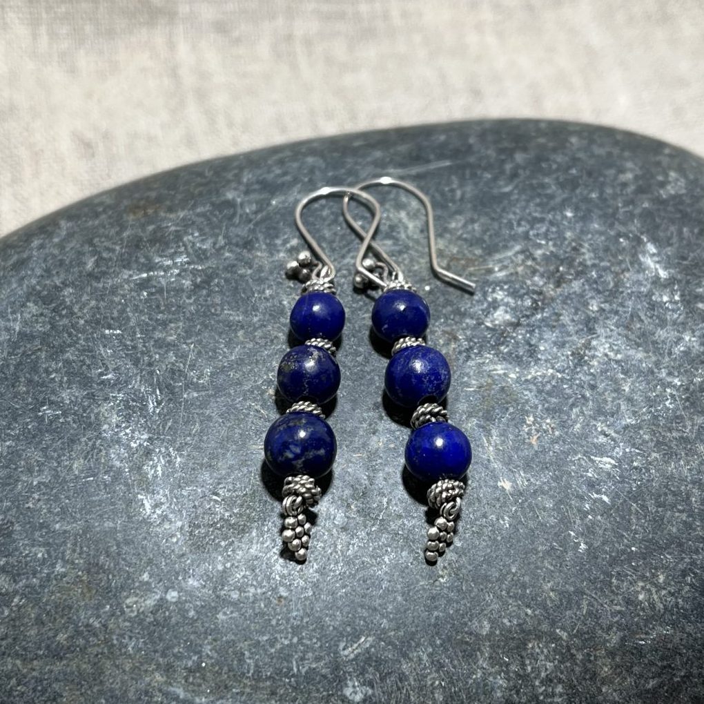 Deep blue lapis lazuli beads, handmade silver beads and small dangles, on silver hooks