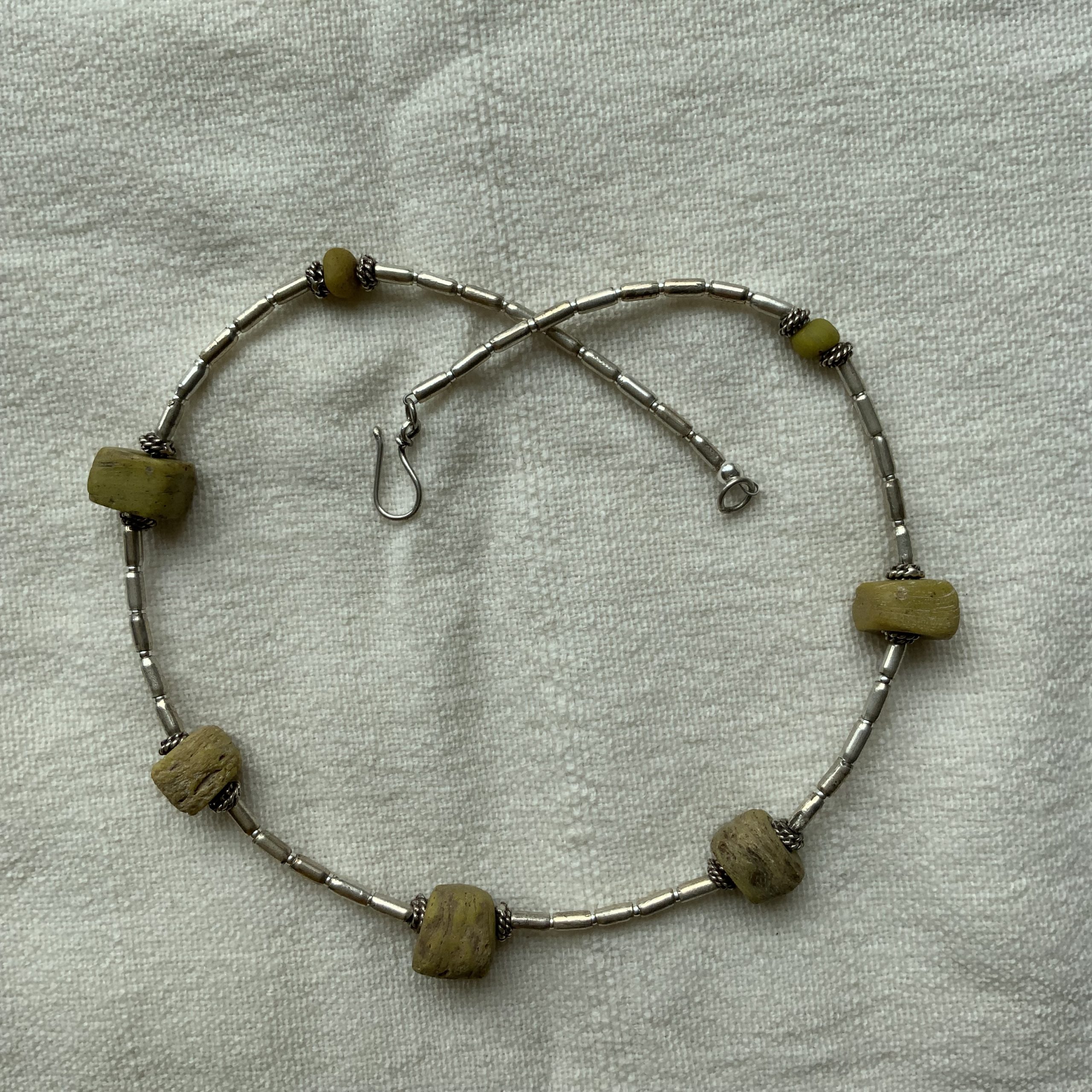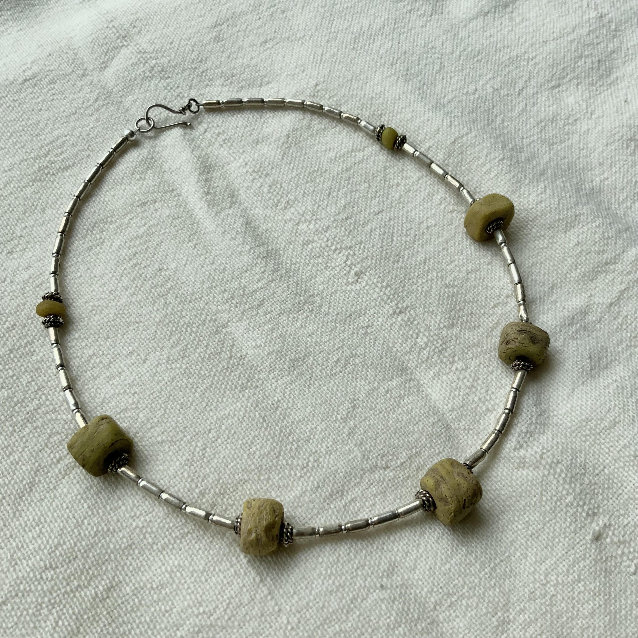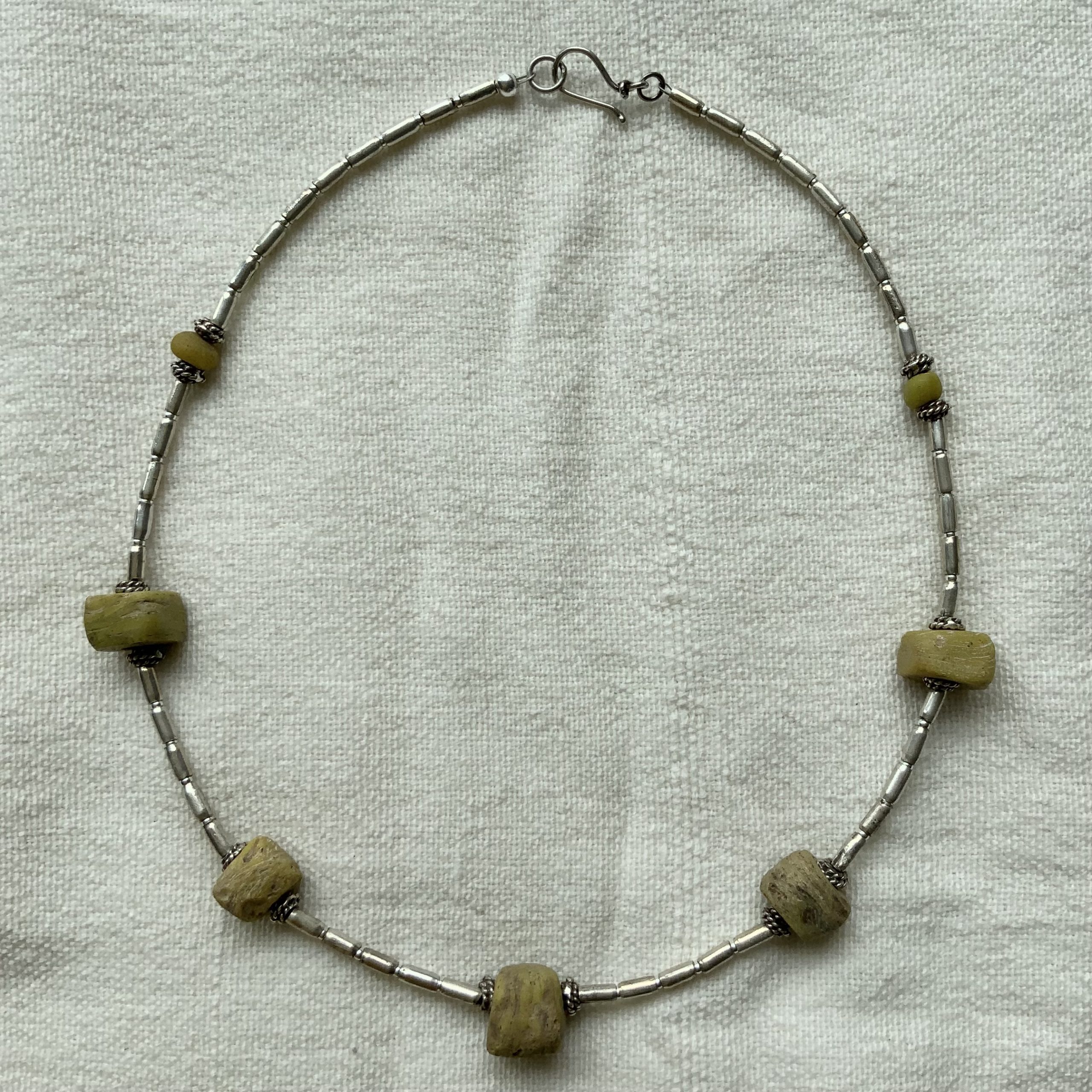 Old Hebron glass trading beads from Palestine, Zanzibari tradewind beads and handmade silver beads
