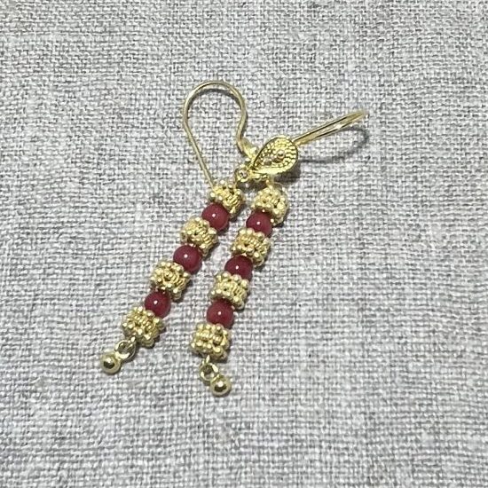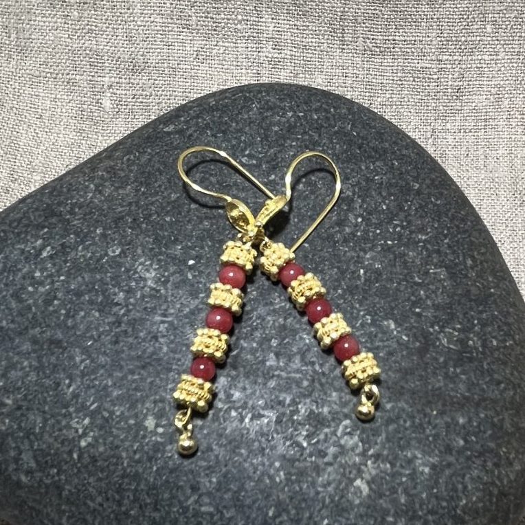 Ruby beads alongside gold plated silver beads, on gold plated silver hooks