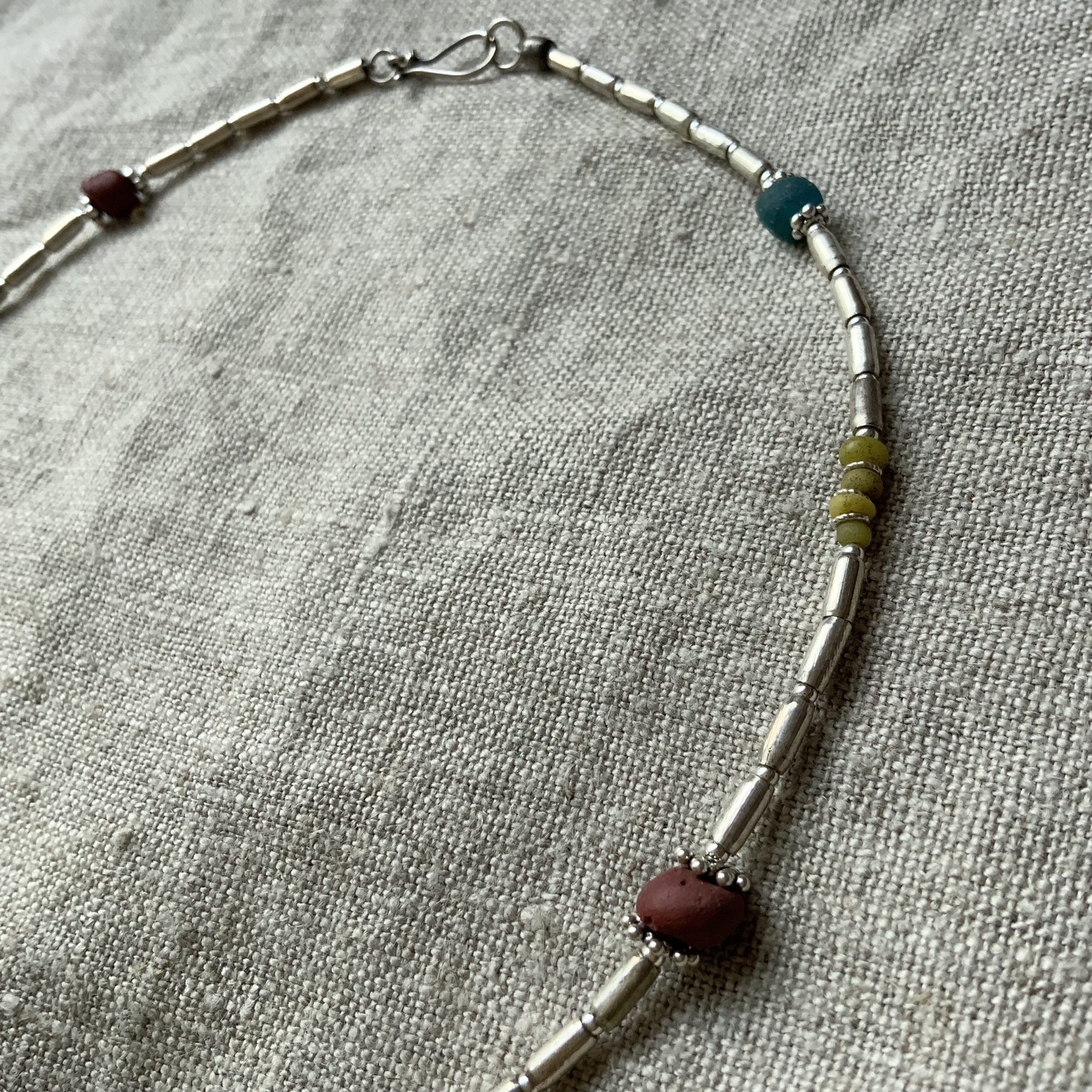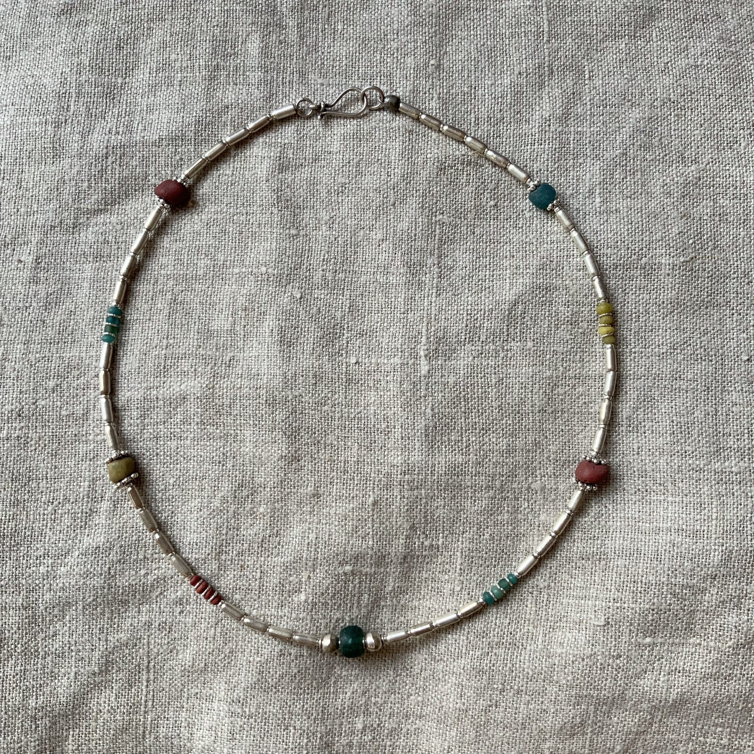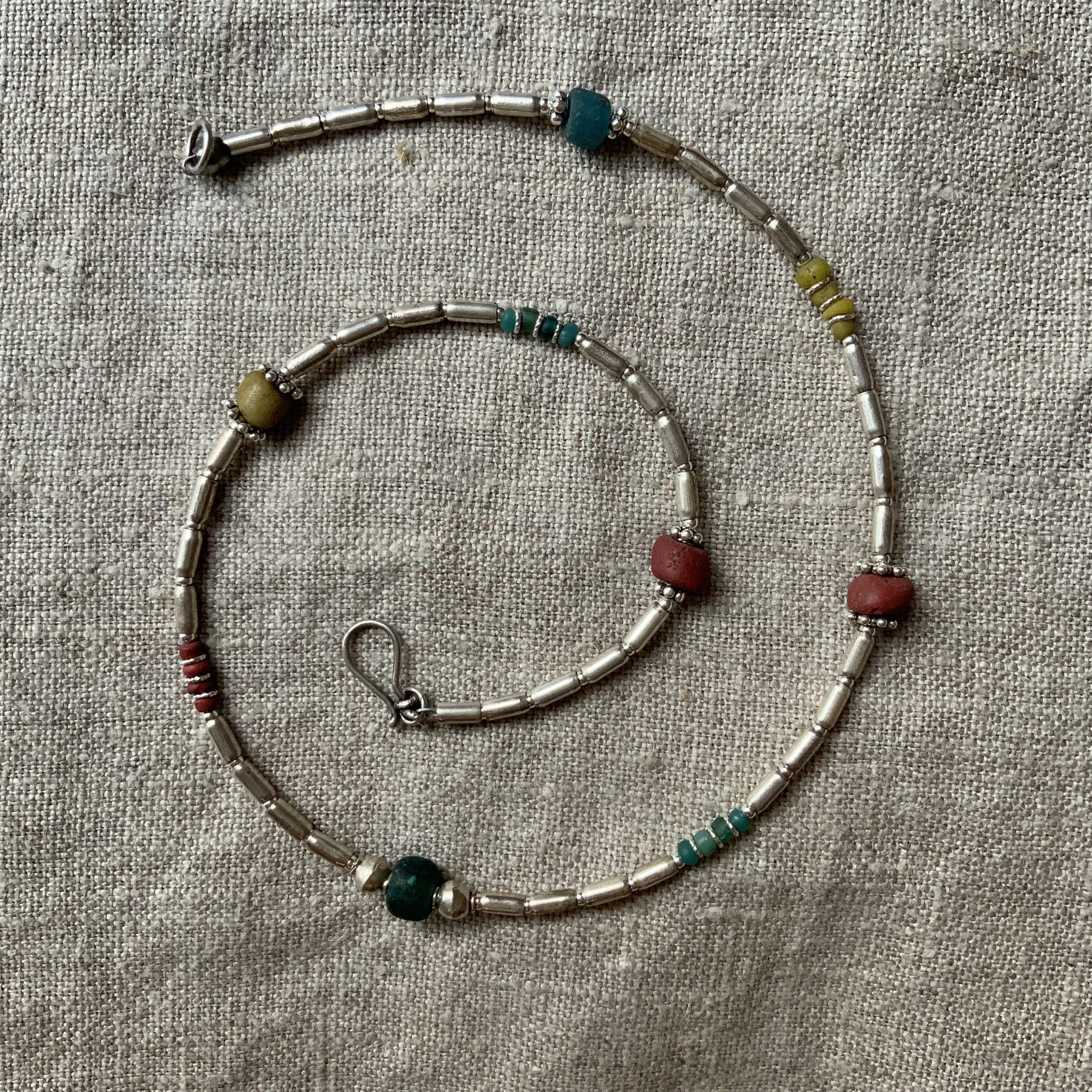 17th century Zanzibari tradewind beads in earthy colours, Ethiopian silver shanga beads